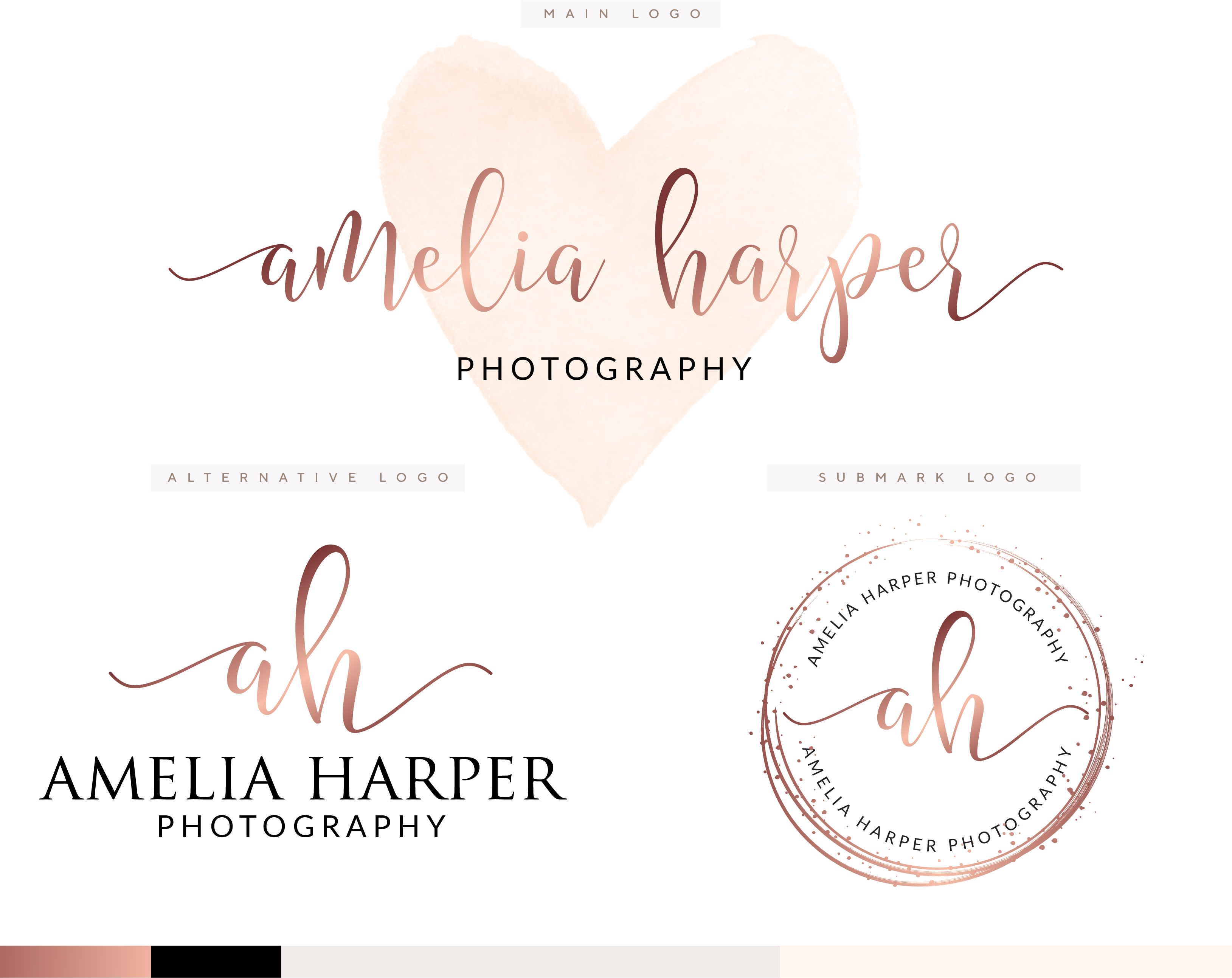 Branding Kit, Rose Gold, Watercolor Logo, Photography Logo, Wedding Photographer, Photography Logo, Logo, Logo Design, Heart logo Branding