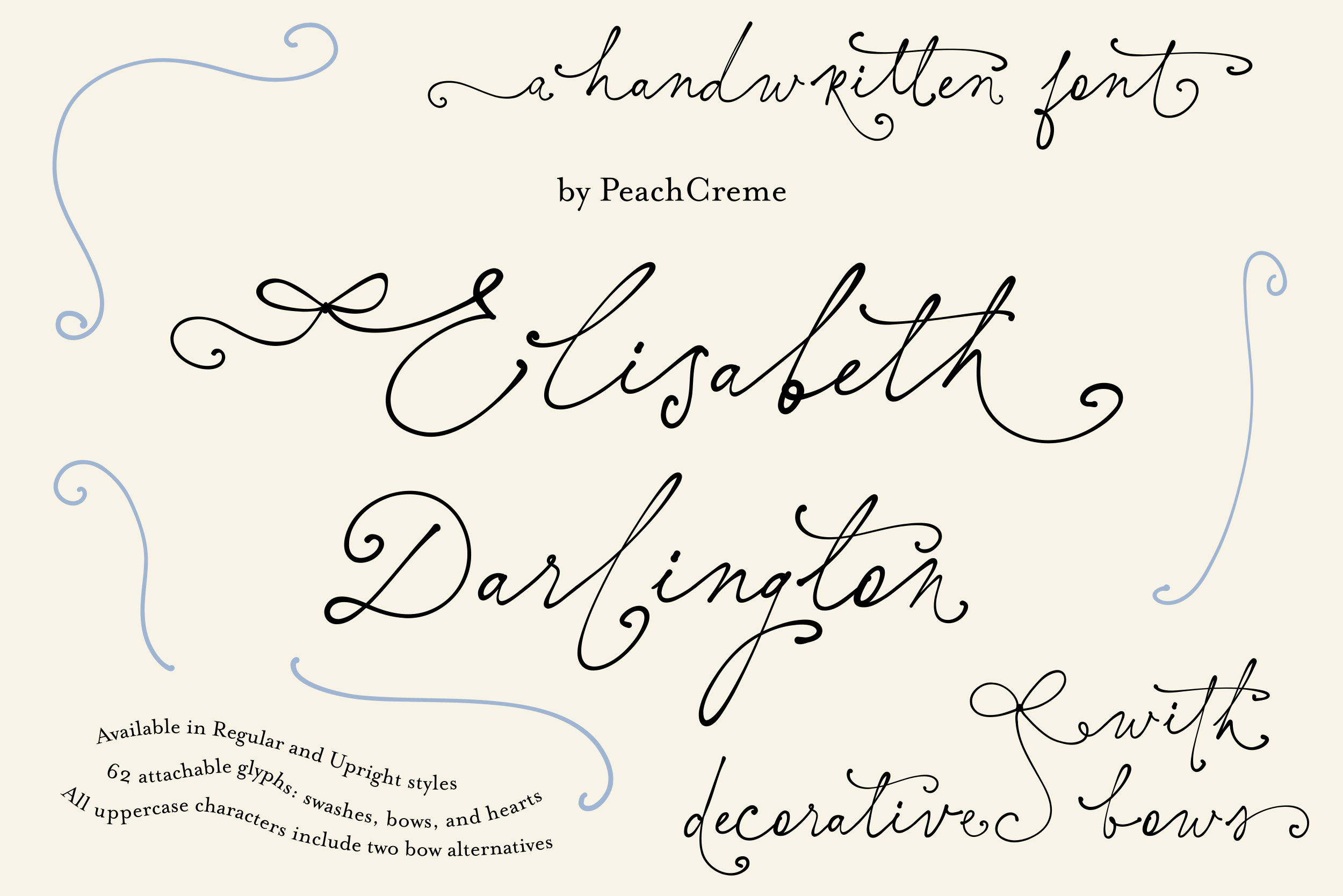 Elisabeth Darlington has been in the making for quite some time. I set out to design a script where the letters connect in a natural flow but still keep a spontaneous, handwritten character. It’s not the kind of script where letters simply stand side by side. I worked to give it a sense of movement and authenticity.