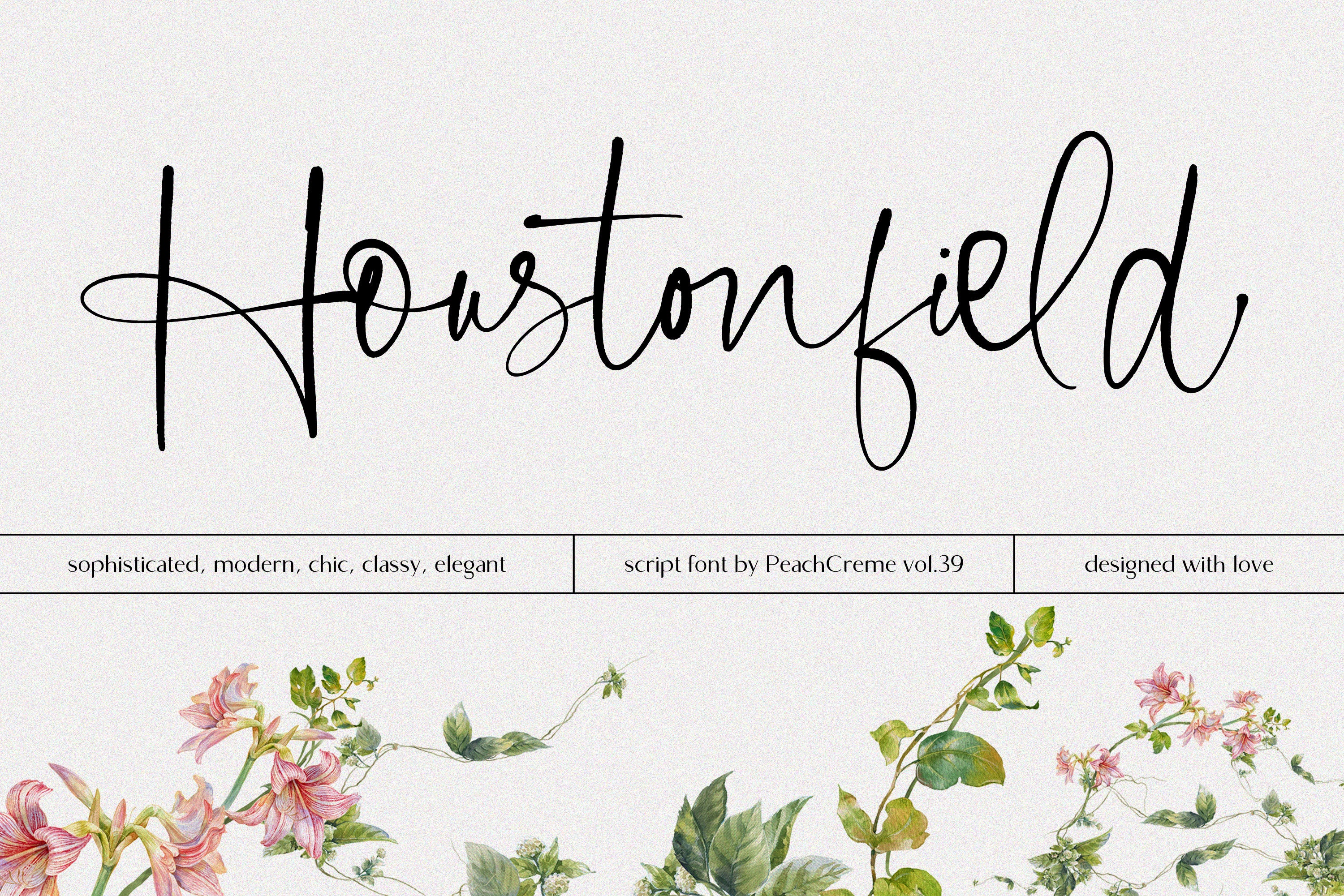 Houstonfield is a stylish, chic script font. Add a touch of luxe and elegance to your projects. It's perfect for signature logos, wedding invites, wine labels, and many more.