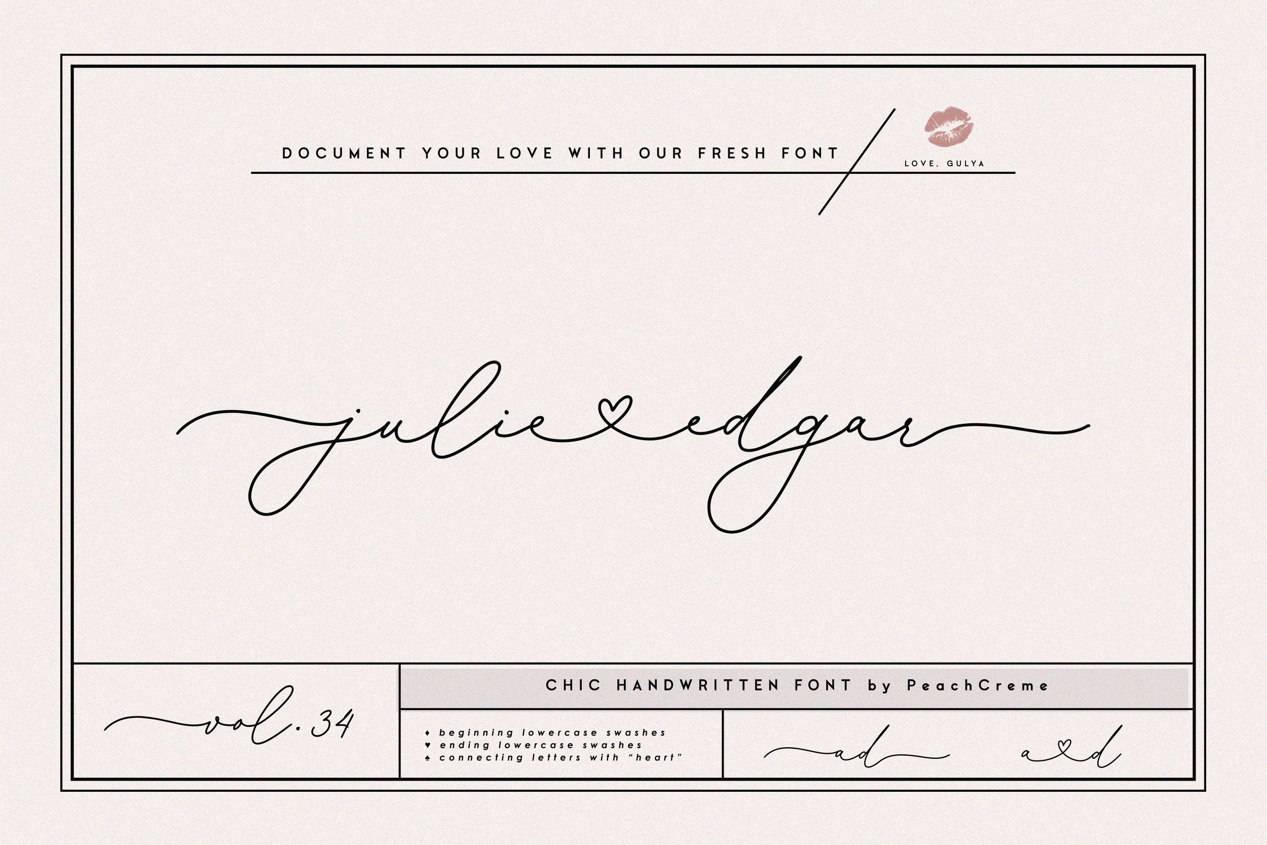 Additionally, includes beginning and ending lowercase swashes and connecting lowercase "hearty" letters. Please, note that heart connects ONLY lowercase letters.