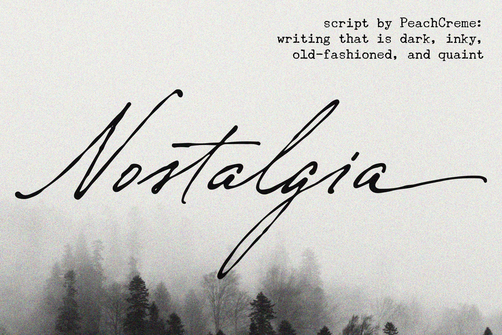 The "Nostalgia" font is a dark, vintage style that includes all the basic characters (letters, numbers, and punctuation) and is very simple to read. "Nostalgia" was inspired by inky handwriting with a natural flow and has fantastic starting and ending lowercase swashes. It works well for a wide range of projects, from wedding stationery to Instagram quotes to contemporary logos to packaging to websites.