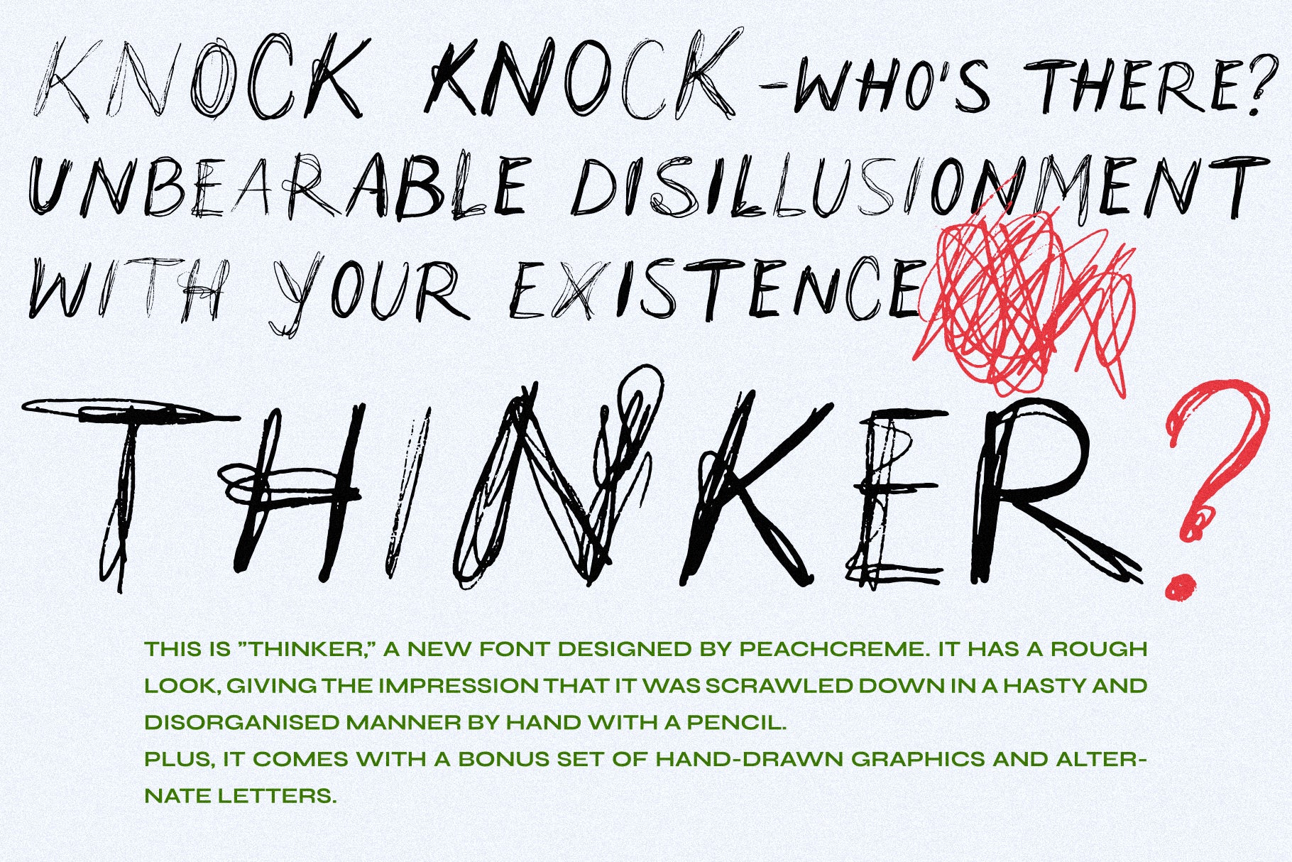 This is "Thinker," a new font designed by Peachcreme. It has a rough look, giving the impression that it was scrawled down in a hasty and disorganised manner by hand with a pencil. Plus, it comes with a bonus set of hand-drawn graphics and alternate letters.
